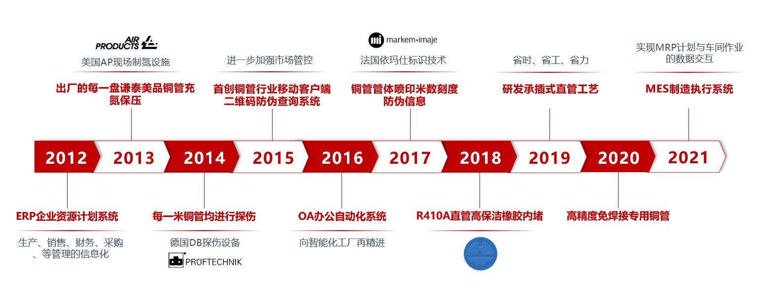 始建于1993年9月的青島宏泰銅業(yè)有限公司,座落于山東省青島市平度同和工業(yè)園同和路97號,從1993年開始一直專注于紫銅管系列產(chǎn)品的研發(fā)和生產(chǎn),是高精度高清潔R410A銅管、給排水銅管、內(nèi)螺紋銅管、蚊香型盤管、醫(yī)療氣體用銅管、地暖管、外徑54毫米以上大口徑銅直管、暖氣片銅管、保溫銅管、覆塑銅水管、毛細(xì)銅管等紫銅管的生產(chǎn)專家與領(lǐng)跑者。宏泰銅管被廣泛應(yīng)用于空調(diào)主機(jī)、中央空調(diào)或多聯(lián)機(jī)空調(diào)、冰箱、冰柜、太陽能、散熱器、導(dǎo)電、健康飲用水、地暖安裝工程、醫(yī)療器械廠和造船廠等。宏泰公司的銅管產(chǎn)銷量在山東省同行業(yè)中遙遙領(lǐng)先,其中宏泰“ logo-防偽 ”牌R410A冷媒專用銅管是全國制冷市場認(rèn)知的高端品牌。